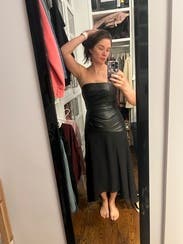 This dress exceeded my expectations. I tried on the size 4 (it fit) and then the size 2, and the smaller one hugged and cinched and lifted in all the right places. Felt like it was made just for me. There is an inside strap and support making it easy to wear without a bra. Not a single readjustment needed - no tugging it up despite a fair amount of dancing that night. The skirt is soft and drapes beautifully. I paired it with tall nude heels for an elongated leg (and to keep the dress from trailing). My black heels looked nice but made the eye jump around. Nude let the dress just flow. Accessorized in golds but you could accent in any color with this dress. I paired a sweet Cult Gaia Banu bag that echoed the leathery folds of the gown. Unfussy fabric meant no ironing or creasing and it was comfortable to wear and sit/stand/dance. I couldn’t have been happier with this selection.