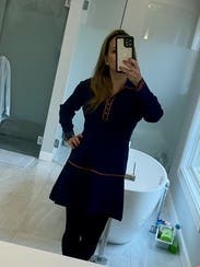Received tons of compliments on this! Very comfortable and stretchy due to the knit material. A little heavy so not the best for warmer months. The red horizontal hem does cause a slight peplum effect on the skirt that is a little awkward, but nothing too dramatic.
