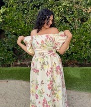 Off-white (48% Linen, 22% Recycled Polyester, 21% Acrylic, 9% Cotton). Cocktail Dresses. Off-the-shoulder. Short sleeves. Back zipper closure. 44" from shoulder to hemline. Imported.