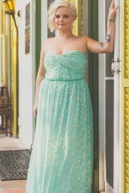 LOVED this dress! I paired it with Nicolle Miller's Southern Plantation Earrings and Lauren Merkin's Gold Eve Clutch for a friend's wedding in the penthouse at Lincoln Center at NYC. The color & light sparkle in the dress was gorgeous. I received many compliments on it! My only complaint is that the lining of the top showed a bit along the neckline. Also, I am 5' 8" and RTR doesnt have long sizes in this dress. So I had to wear flat sandals with this dress. The color is a little more blue and not as green as the pictures indicate. But other than that, I simply loved this dress! It was extremely comfortable & easy to dance in.