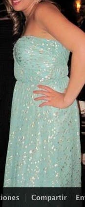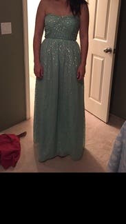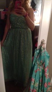 I wanted a fancy dress for my senior ball but I also didn't want to buy a long dress that I was only going to wear once. I saw this dress and fell in love right away. I was a little afraid of getting a dress that hadn't been reviewed yet, but I'm glad I took the plunge. The spots are a little more silver than the picture shows, but the minty color online is pretty true. This dress was a little difficult to zip up; the seam kept getting in the way and it was definitely a two person job. Also, the dress had some boning that started poking after a little bit, but it was bearable. It was also a little long for me, but I'm short and wide, so it will probably be ok for girls that are more proportionate than I am. I really liked the look of this dress and got a lot of compliments. It was a great introduction to RTR and I will definitely be renting again.