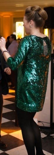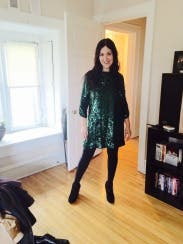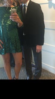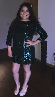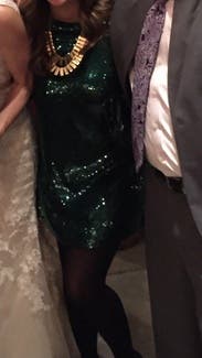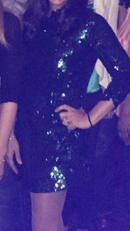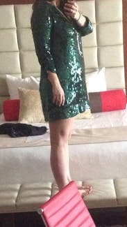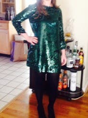 This isn't your run-of-the-mill sequin dress; this is high-quality material that looks like shiny liquid when you put it on. It is very forgiving for those of us who have had children and still have a few extra pounds, but anyone over five feet should be concerned about the length. Since the sleeves are tight, arms over your head = everyone sees your undies. I'm under five feet, so this came off as a very sophisticated choice. I normally am a size 6, but wore the 2.