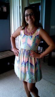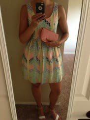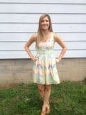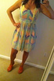 I wore this dress for a summer wedding, but the colors would definitely work for the spring too! This dress is fun and definitely comfortable. The colors are a lot brighter and more vibrant in person. As far as the fit goes, it fit perfectly. I could see the top being a little big on someone with a much smaller chest and a little tight on anyone bigger. Paired with nude heels and fun jewelry, this dress won't disappoint.