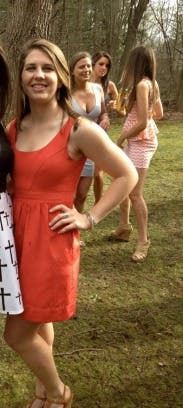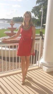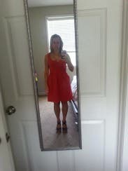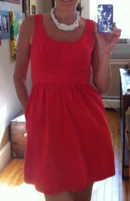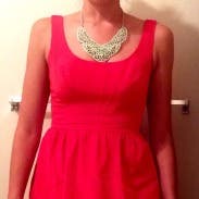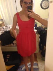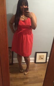 I had a baby several months ago but haven't lost all the extra weight yet. I needed a dress for a wedding that would hide all my post-pregnancy problem areas - mainly tummy and larger chest, but would be classy not frumpy and fun. The dress arrived in perfect condition. It's red but with a orange hue which was great for spring. The straps are perfect for wearing a standard bra, and the dress also has pockets - who doesn't love pockets on a dress? I'm very short at only 5'1" I was nervous about it being too long on me but the length was perfect, it hit just above my knee and paired up with nude pumps it elongated my legs. I ended up wearing one of my other backup dresses from RTR, but this was a wonderful option and I would def rent this again for the right occasion.