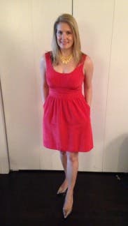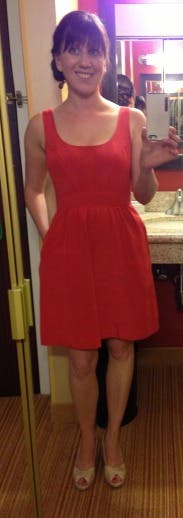 Easy to dress up or down (wedges or flats for a daytime event - heels at night). Loved the pockets and the bra strap snaps. The size 2 was a little big but the 0 wasn't available. Very flattering and comfortable. This is more of a tomato red.