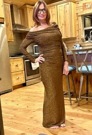 Very beautiful dress. It was fun to wear some thing besides basic black. It managed to be sexy, but still modest. I wish I had ordered it a size smaller because the fabric stretches quite a bit. I think a smaller size would have made the off the shoulder piece a little more manageable. I had to use butt glue to keep the neckline where I wanted it and to keep my bra showing underneath my arm. But it worked out fine. I was also pleased that it wasn’t too long. It was exactly the right length with a pair of heels. I would definitely order this dress again, if I had the occasion for it.
