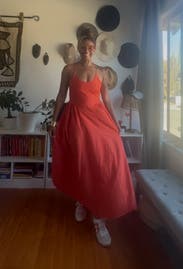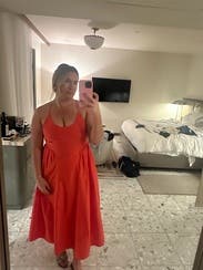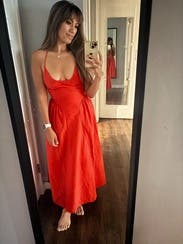 I enjoyed the dress was nice and breezy, the only down fall was the cleavage. Not super flattering for me and the tie in the back is pretty but was hard to keep the neck from loosening too much had to adjust a bunch. Better for someone with a smaller chest, but was a nice effortless pop of color!
