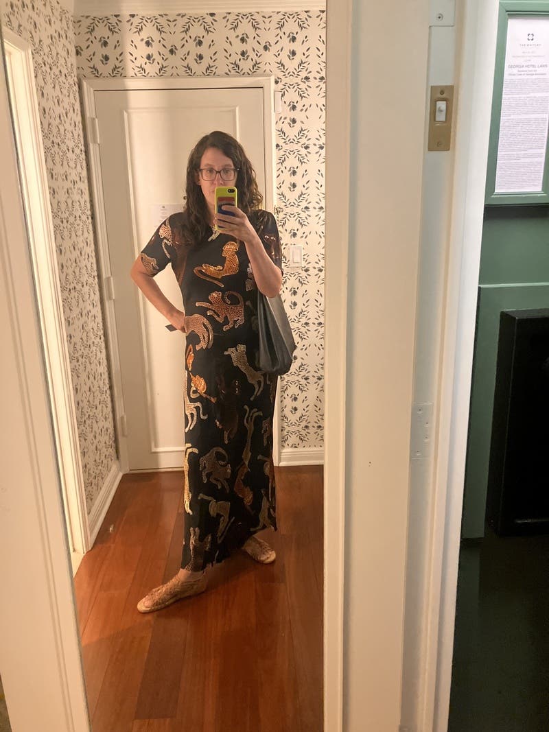 We are living for the artful look of this silk jaguar motif midi dress by Silk Laundry. Let the cool print shine when you pair this frock with ballet flats and simple gold jewelry.