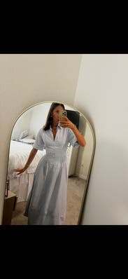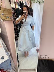 I love this dress. I wore it to work and have never felt so comfortable and confident. It is a pale blue color perfect for spring and has such a full skirt that accentuates your waist and bodice. I am shorter (5 4”) and it goes down to my ankles so I wore with wedges. I also have a smaller chest so the low cut was not an issue for me. The material is also super cool and chic. I will rent this again!!!