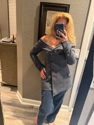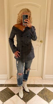 Trust the reviews - this is the perfect blazer! Fit is perfectly tailored and the bare shoulder...chef's kiss!