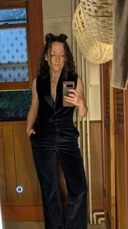 I felt fabulous in this velvet jumpsuit. I had to size up (one) and the length was (still) a little short, but it felt and fit great. Very comfortable. I wore a navy shirt underneath and loved the pockets.