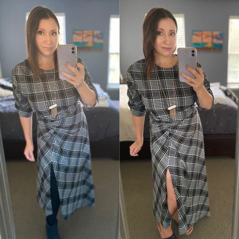 Green and grey plaid (100% Cotton). Hourglass. Short sleeves. Crew neckline. Hidden center back zipper with hook-and-eye closure. Fully lined. 52" from shoulder to hemline. Imported.