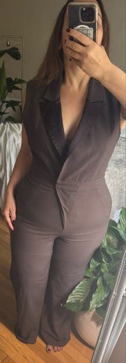 I sized down because I wanted a form-fitting look. Sticking to my actual size would have just made it more “work-modest” but I preferred the snug look. Front pockets are nice and deep, there are back pockets, but they are sewed closed. The pants legs have fun fasteners that you can open if you want flare. It was so versatile. I loved this jumpsuit! Rent it! My sole criticism is that the color is different from what I expected. I thought I was ordering a black tuxedo jumpsuit but it was like dark ashen brown or off black with a brown tint. So not quite chocolate brown, and not quite black. Couldn’t tell if that was intentional or if it had been over-washed. When I wore it to work, I topped it with a collar-less blazer of mine that is so old, its original black color faded to whatever color this is. Otherwise I wore it without any blazer. Got so many compliments.