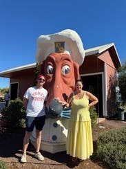 The dress is the cutest! Could size down in it, the top part is very stretchy. Definitely a thicker material so could get hot. Very flattering!!