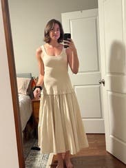 This dress was so comfortable and chic. It could easily be dressed up or down. Felt so classic but very on trend. The skirt needed to be steamed out a lot, but fell well even when it was wrinkled. It wasn’t the most flattering on my stomach which is the only reason i didn’t give it 5 stars!
