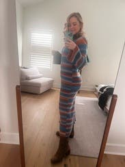 This warm, snuggly sweater dress was perfection! The colors are amazing for fall, and since the dress is rather heavy, it falls so nicely!