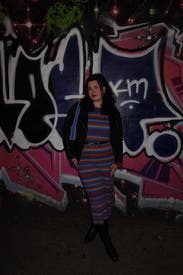 This vibrant, striped knit dress by Simon Miller exudes a playful yet sophisticated charm with its cozy texture and bold color palette. Perfect for transitioning from day to night, pair it with sleek boots and minimal accessories for a chic look.