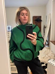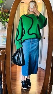 This is very 80’s with the oversized fit and squiggly black lines. I french tucked it into a denim skirt and thought it looked pretty good but that was the only way I liked it styled on me. Sleeves are very long and the sweater length is over the butt so its a lot of sweater. Size down if you can. Not itchy.