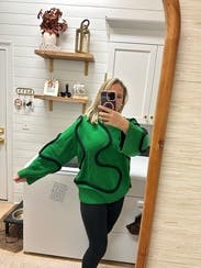 As others have said, size at least 2 sizes down and you’ll still achieve an oversized, cozy sweater look. The black swirl detail is so fun but the overly oversized blew my high and made it so hard to style. Ended up wearing as a sweater dress.