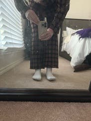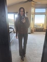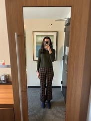 These pants fit incredibly well- I loved them as I put them on! But the pattern in the front really highlights your private area in a negative way. I had to wear a longer shirt to cover in the front because I felt pretty uncomfortable with it, but loved how the pants fit everywhere else! Note- I took this photo with snow boots on which made them look odd in the flare, but the flare was perfect