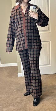 Fit: I rented the pants in a Small and they fit perfectly — more snug and tailored than the matching XS shirt, which created a nice balanced silhouette. Review: These pants are such a win. They’re super comfortable, have just the right amount of stretch, and the fall pattern is even better in person. On their own, they’re surprisingly sexy and streamlined; paired with the oversized shirt, they give that effortless, fashion-forward set look. A great option if you want something comfy that still feels put-together. Styling Notes: Wear them with the matching top for a cool, coordinated vibe, or style them with a fitted turtleneck or bodysuit when you want something sleeker. Black booties worked perfectly with both looks.