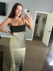 Picture looks like it’s black/white but it’s actually an army green. Dress was cute for hot weather. Could be dressed up or down. I just wore it to a date night with my hubby. Length was perfect.