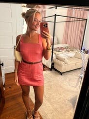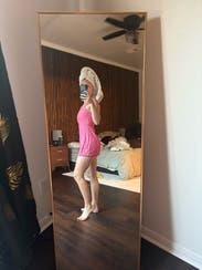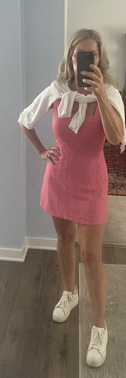 Very flattering dress! I'd you've got blonde hair, get ready to be called Barbie all night long. Its super pretty, but the fabric after a few hours does wrinkle. I wore spanx under and it was so short that I kept having to pull the skirt down and the spanx up! 😂
