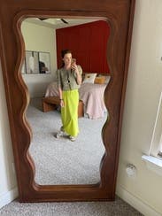 This is my favorite matching set I’ve ever rented! The print is playful but still wearable, and it works perfectly as a full look or as separates. The top pairs well with *everything*. Ive styled it for work (with a tank under) with slacks or a skirt. Ive also just worn a bralette under for non-professional settings. I am seriously considering buying this set. The only downside is it’s dry clean only—otherwise, I’d wear this constantly.