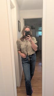 Dressed this shirt down with jean shorts so it was perfect for casual brunch in Brooklyn. The 3 ties in the front were super on trend but sadly not bra friendly. You might’ve gotten away with a little bralette hidden under the. shirt. Overall great rental!