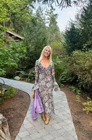 Wore this dress to a Zach Top concert and got a ton of compliments! The dress was snug in the arms (which I like) and in the shoulders because I have broader shoulders. Easy to wear with a bra or without. Incredibly comfy dress. Great length, especially with boots. Debated purchasing it because I loved it so much and it can easily be dressed up or down but I want to try the other color in this dress before making that decision. Would definitely rent again!
