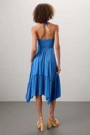 Blue Rayon (100% Rayon Challis). Hourglass. Halter neck. Sleeveless. Pull-on. 45.5" from shoulder to hemline. Imported.