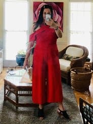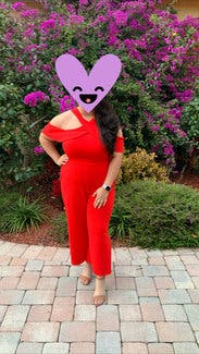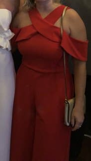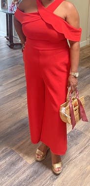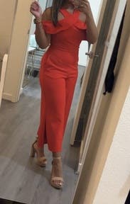 The formal dress I had ordered for a black tie beach wedding sadly didn't make it to me on time. Luckily, I had this beauty on backup from my monthly Update options. I've never worn a jumpsuit before, but this one has made me a believer! It was comfortable (form fitting but not too tight), looked formal enough for the occasion, had pockets, and had fun, flowy side slits in the pant legs. It was perfect to dance in! I'm also not usually a red person (see: sunburn), but I actually loved the color. I got so many compliments-- even from the bride! The only downside was needing some help unzipping/ re-zipping for the restroom. I LOVED this jumpsuit and would definitely rent again!