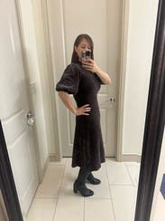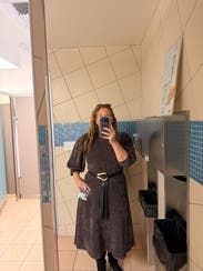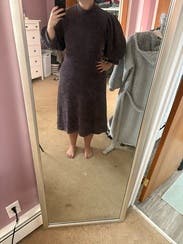 This is a cute sweater dress that runs a bit large. There is a bunch of extra material at the waist on me. Very cozy for this cold, snowy day in NYC. Paired it with brown suede boots. Would like it more if it were a different color (I feel really washed out in this today). Don’t know if I’ll rent again.