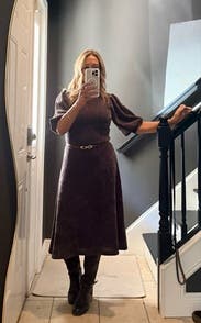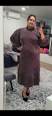Nothing super special, but a very cozy thick sweater dress with a little more definition in the waist than a typical sweater dress!