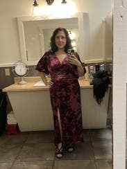 Pink Merlot floral velvet (95% Polyester, 5% Spandex). Hourglass. Short sleeves. V-neck. Back zipper closure. 55" from shoulder to hemline. 14" slit. Imported.
