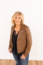 Love the fit of this jacket. It's not too boxy and the leather is so soft and supple making it extra comfy. Great, neutral brown color.