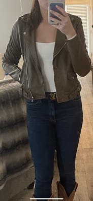 I really liked this leather jacket. It was buttery, light yet warm. The color matched with many outfits and was a bit softer than your typical black leather jacket. And petite friendly!