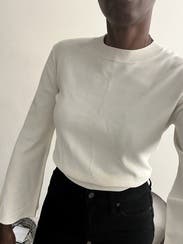 one of my favorite pieces! largely due to it’s versatility and quality: dress up or down, comfortable in ANY weather, color being a clean shade of cream that not only flatters but goes with nearly everything. arms nice and long, wide from the elbow down, giving it that small touch to make it stand out (and keep from boring). love the tight collar, and the overall length could not be more on point.. it’s the PERFECT top.