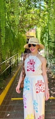 Rainbow embroidered designs cover this classic white Something Navy jumpsuit that will keep you cool and stylish in the warm weather.