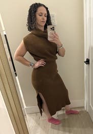 Brown (29% Acrylic, 29% Nylon, 23% Wool, 15% Cotton, 3% Cashmere, 1% Elastane). Casual dresses. Turtleneck. Sleeveless. Pull on. Shoulder to hemline length: 45". Imported.
