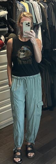 I like these! Not 100% my "style" but enjoyed them. Drawstring waist which I always love, super comfortable, lightweight. Prone to wrinkling a bit after sitting which you can see in the pic. Color is a little more teal-ish. I'm an 8/10 in pants typically and the 6-8 (M) were def the right size, extra room to spare. Like that you can tie the ankle drawstrings to make them either more tapered, or keep them wide leg. A good rental, as this is a style I typically wouldn't buy, but it's fun for a few wears.