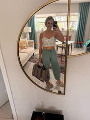 Cute details with the drawstrings at the ankles. Paired with a black tank top and flip flops for a cute vacation outfit.