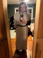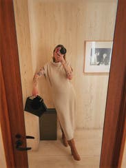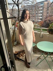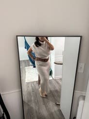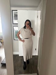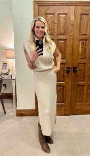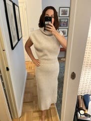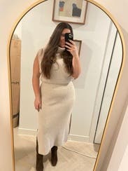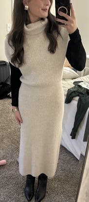 I love the idea of sweater dresses but get nervous if they look like they'll be form fitting. The draping on the top of the dress really helped balance everything out. Glad I went with the XL. I found it quite flattering. Great for fall/winter into early spring because of the light color and short sleeves. Would definitely consider purchasing.
