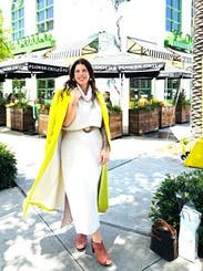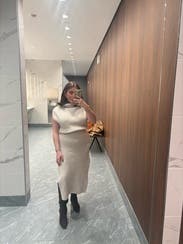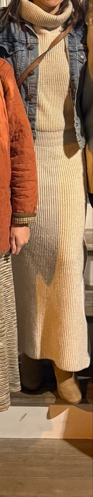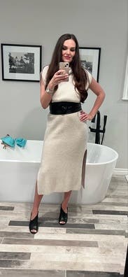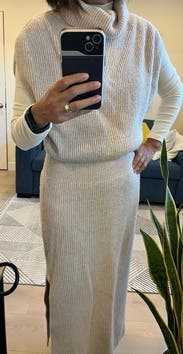 Perfect for business and fun. Loved the high cowl neck. Fabric was extremely comfortable. Had Aliya on both sides above the knee but if wearing a jacket is not seen. Accomplished the impossible task of being a sweater dress which is not too tight. The switch of woven directions at midsection gave a perfect tuck in. Or ability to fold over for accentuation.