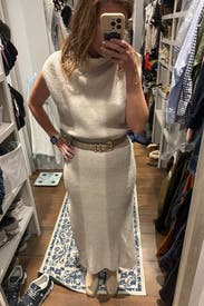 Beige knit (33% Viscose, 30% Wool, 23% Nylon, 20% Cotton, 4% Cashmere, 49% Nylon, 18% Acrylic, 3% Spandex). Casual dress. Sleeveless. Turtleneck. Pull-on closure. 50" from shoulder to hemline. Imported.