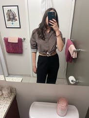 Was excited for this rental after reading the reviews I sized up to account for my larger chest which can cause gaping at the buttons on a button down top. Unfortunately it just made the elastic/cinched hem at bottom of shirt way too loose and big. I could have stayed with my true size. Plenty of room. I knew it was cropped but even with high waisted jeans it was a bit too cropped for even a casual work day. Biggest issues for me were the odd amount of extra fabric on the cuffed sleeves that made it hard to style and smooth out and if I lifted my arm even to fix my ponytail or grab sunglass of my head the entire shirt lifted up almost to my bra. May have been great if I stuck to My true size on this one. Never wore it.