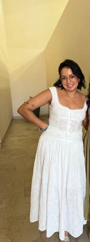 This top is adorable—lightweight, breathable, and perfect for hot weather. The eyelet fabric and corset seaming give it a really polished look. It was a bit tight in the bust for me, so I probably could’ve sized up but even then I would have still had the same issue which was the straps. They constantly slipped down and didn’t stay put, which made it a little frustrating to wear. I think this would work better on someone with a smaller bust. Overall, really cute but not the best fit for fuller chests.