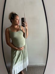 I wore this to my baby shower at 33 weeks pregnant. It was the perfect combination of fitted support and flow. Loved it!