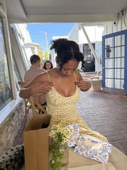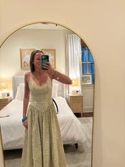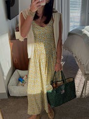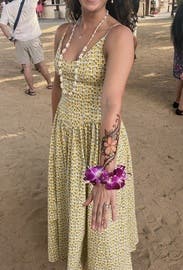 This was so unbelievably flattering! I bought the navy blue version but rented the yellow immediately after! It was the perfect dress for a beach weekend with a friend!