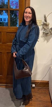 I tweaked the brightness in this pic to show detail (coat is a true dark denim.) I liked the fabric (thick but soft) and the longer sleeve length worked for me but I have long arms. Plenty of room for a light sweater underneath. I wore it with light-wash barrel-leg jeans & brown booties. Will also try it with a knit midi dress for date night. I could definitely see using some fashion tape & wearing it as a dress, as another reviewer suggested. Beware, if you are under 5’5” the length might overwhelm you